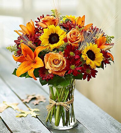 Imagine spending a brisk autumn day browsing the bustling flower markets of Europe. It's easy with our best selling arrangement of orange roses and lilies, glowing sunflowers, poms and more! Hand-gathered in a classic glass vase with charming raffia, it’s a wonderful gift for birthdays, anniversaries or simply to celebrate the vibrant beauty of the season. Arrangement of roses, sunflowers, lilies, daisy poms, solidago and salal, accented with dried fall leaves Lilies may arrive in bud form and will open to full beauty over the next 2-3 days Arrives in a glass vase tied with raffia; vase measures 8"H Large arrangement measures approximately 18"H x 14.5"L Medium arrangement measures approximately 17"H x 13.5"L Small arrangement does not include roses and measures approximately 16"H x 12.5"L Our florists hand-design each arrangement, so colors, varieties and container may vary due to local availability