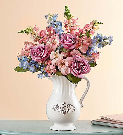 EXCLUSIVE For all she does, make this day one she’ll always remember with our gorgeous, garden-inspired arrangement. A fresh gathering of lavender roses, soft blue delphinium, pink lilies and more is artistically hand-designed inside our new and exclusive “Charlotte” vase, an antique-inspired ceramic white pitcher she can use again and again.