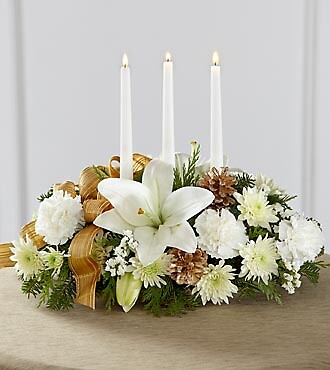 White LA hybrid lilies, carnations, chrysanthemums and statice are arranged amongst holiday greens and accented with gold pinecones and a gold plaid French wired ribbon for an exquisite look. Arranged to encircle 3 white taper candles, this stunning arrangement will bring a sweet sophistication to your holiday festivities.